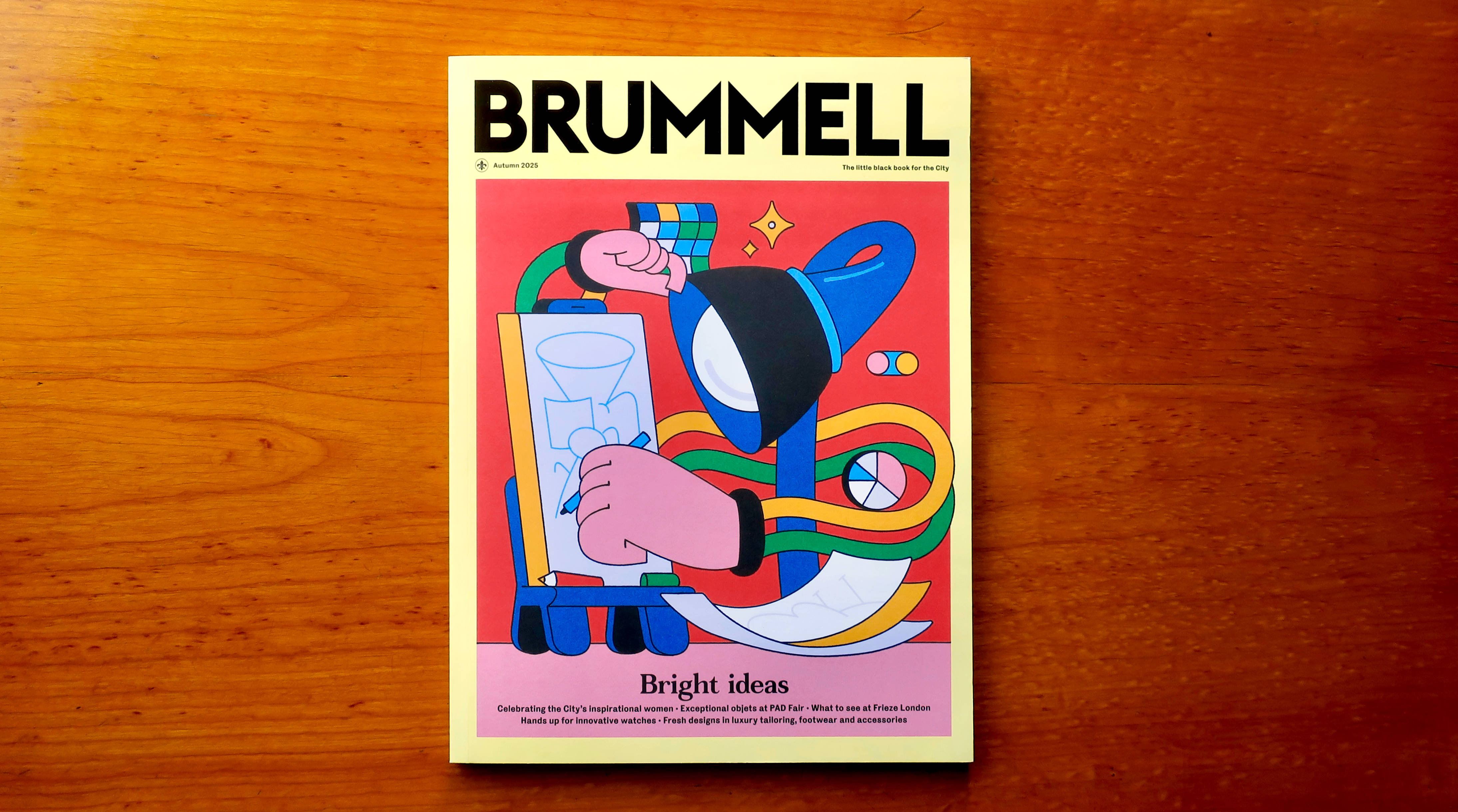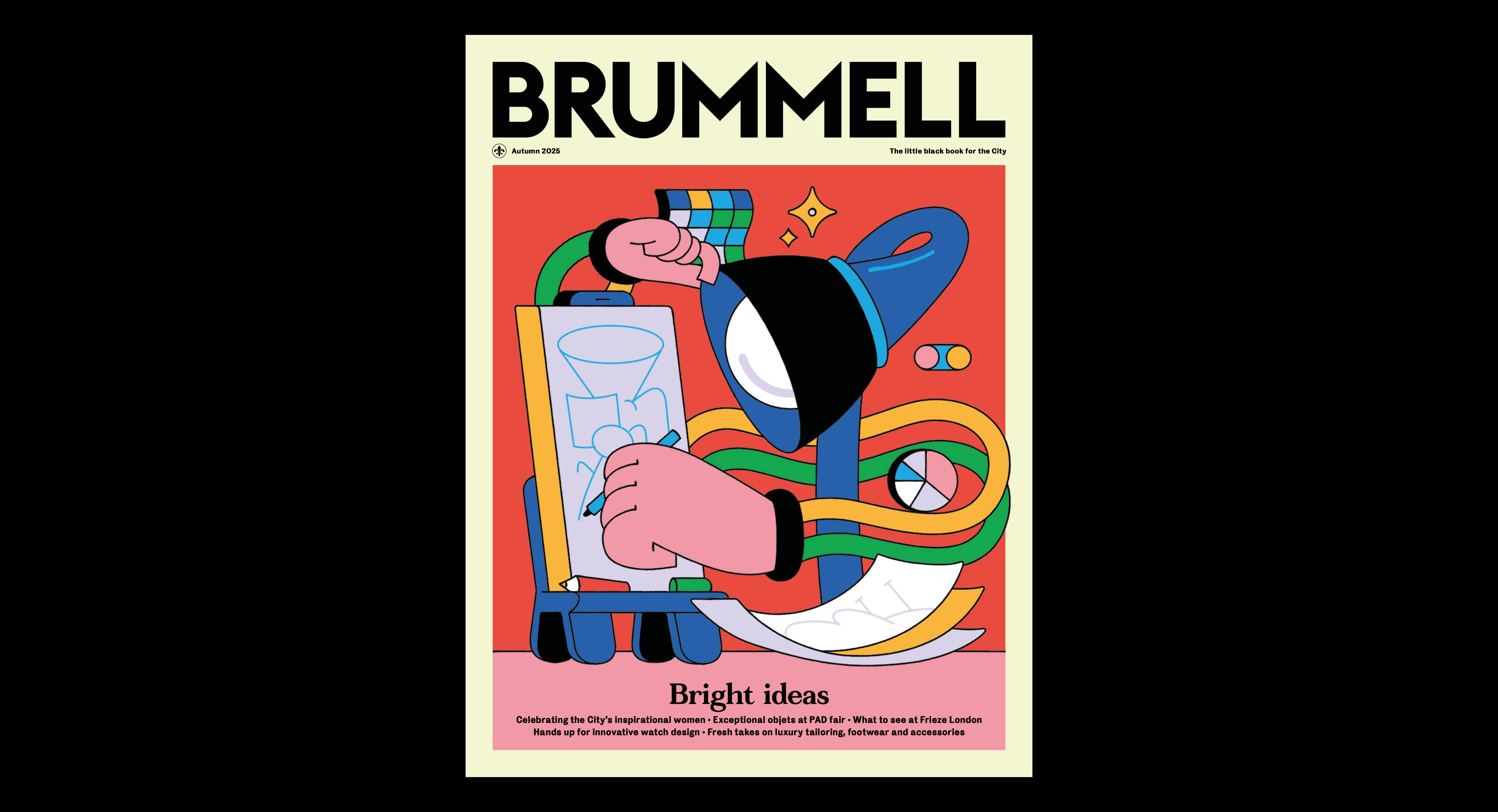 Cover illustration for the Autumn ’25 issue of Brummell Magazine. Brummell is a luxury lifestyle magazine from London. This issue is full of the usual mix of fashion, horology, food & drink and culture with a primary focus on design in the capital.